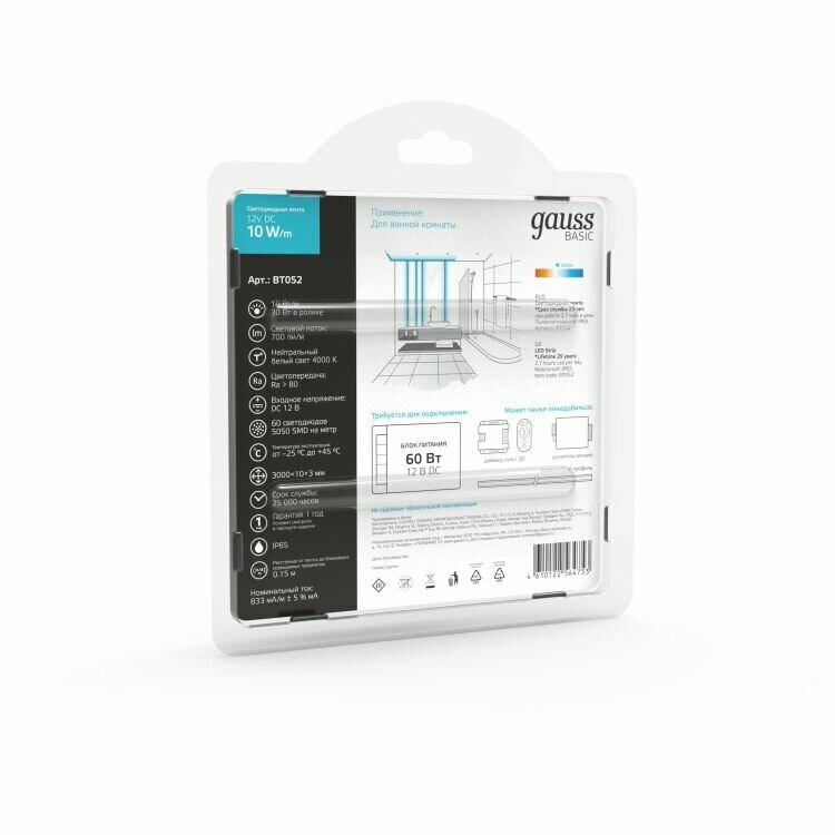 Отзывы на Лента LED (4000К) Basic GAUSS тип 5050 DC 12В 10Вт 700лм/Вт 60led/м IP65 10 мм (бухта 3м) (комплект 6 шт)