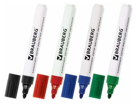 Маркеры/фломастеры для магнитной доски стирающиеся Brauberg, набор из 4 шт., 5 мм, классические, ассорти, круглый наконечник