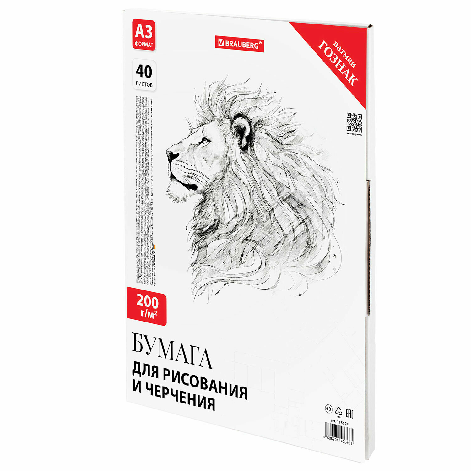Бумага для черчения, творчества и рисования для школы канцелярская, папка с листами А3, 297х420 мм, 40 л., 200 г/м2, ватман Гознак, Brauberg, 115624 информация: