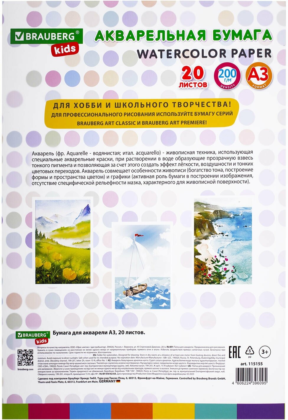 Комплект 2 шт, Бумага для акварели большая А3 в папке, 20л, 200г/м2, индивидуальная упаковка, BRAUBERG KIDS, Лисичка, 115155 информация: