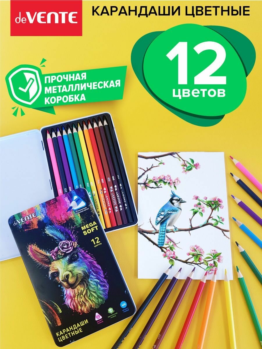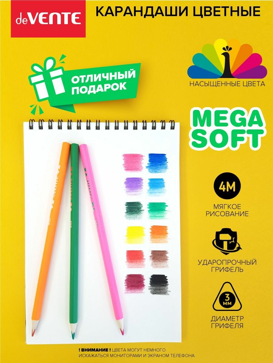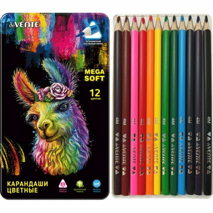 DeVENTE Карандаши 12 цветов, deVENTE Trio Mega Soft, трёхграннный корпус, 4M, 3 мм, металлическая подарочная коробка