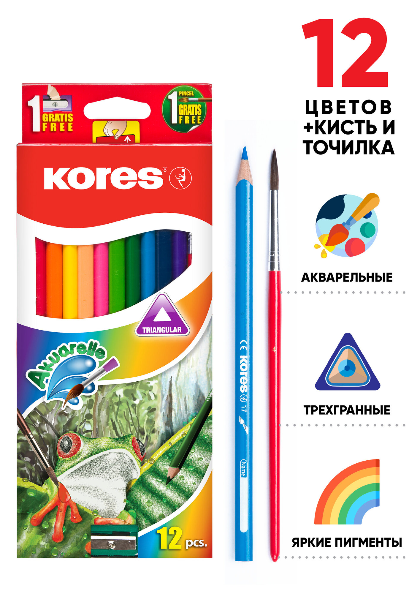 Карандаши цветные акварельные Kores, трехгранные, толщина грифеля 6 мм, набор 12 цветов + точилка и кисточка информация: