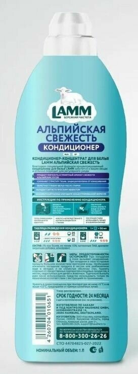 Кондиционер-ополаскиватель для белья универсальный LAMM (Ламм) Альпийская свежесть, 1л, 40 стирок, концентрат информация:
