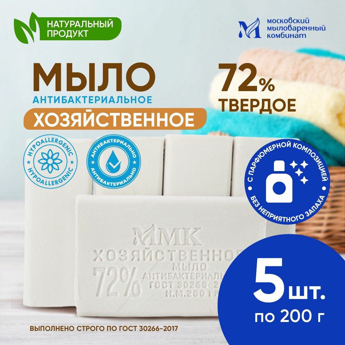 10 цен на Мыло хозяйственное 72 % антибактериальное,твердое.200 грамм.5 штук. Московский мыловаренный комбинат