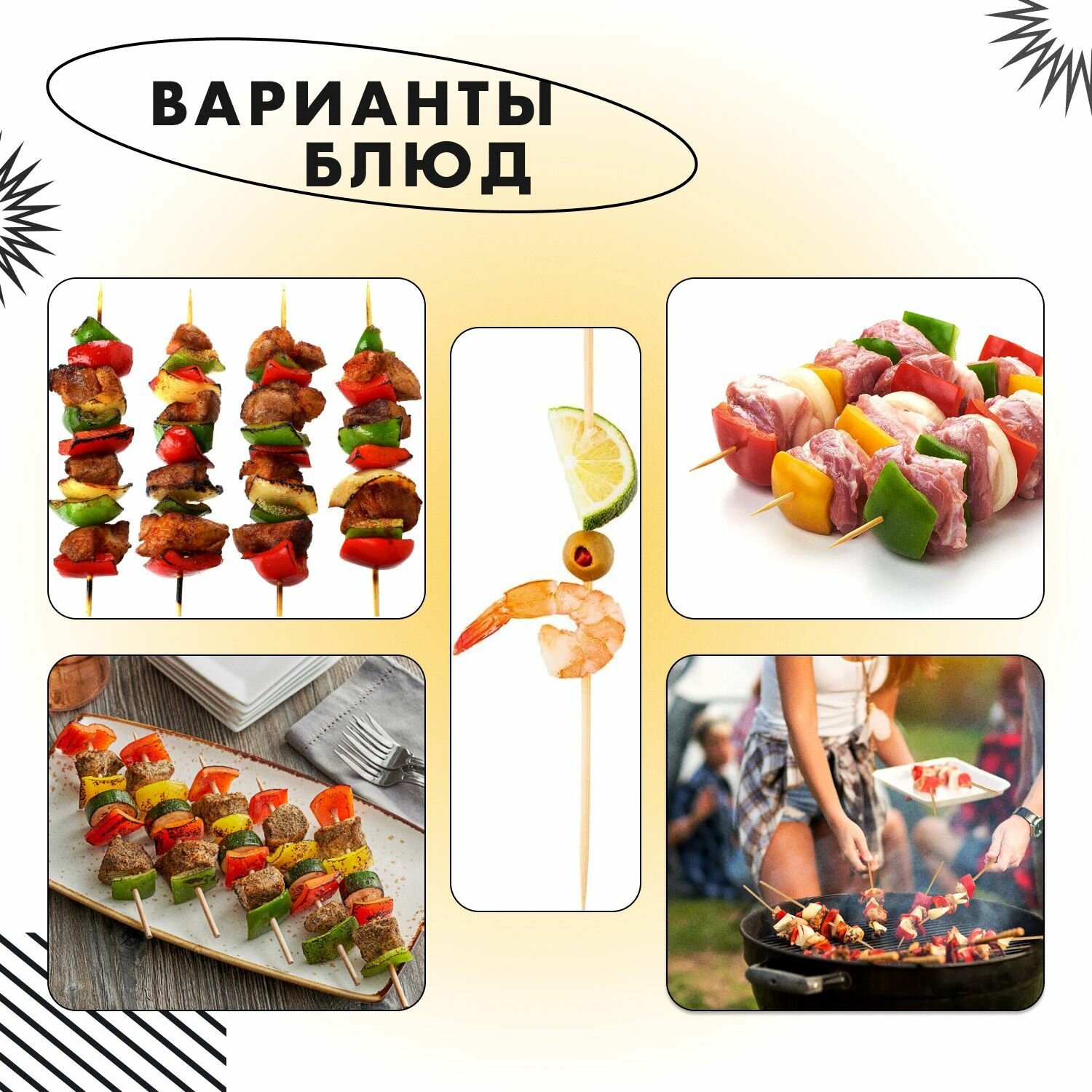 | Комплектация | 100 деревянных шампуров, заостренных на одном конце |