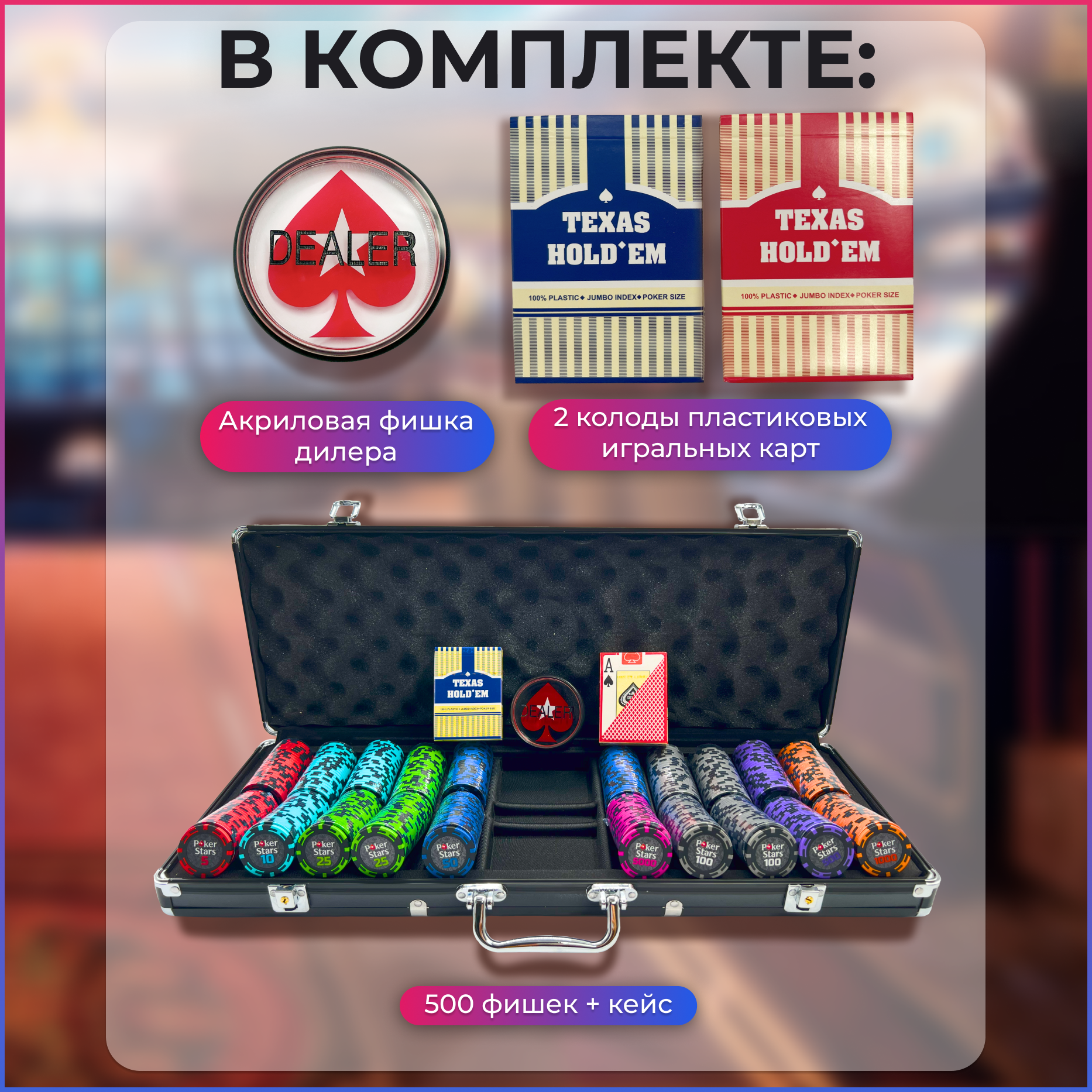 | В наборе | 500 фишек, 2 колоды пластиковых карт, акриловая фишка дилера |