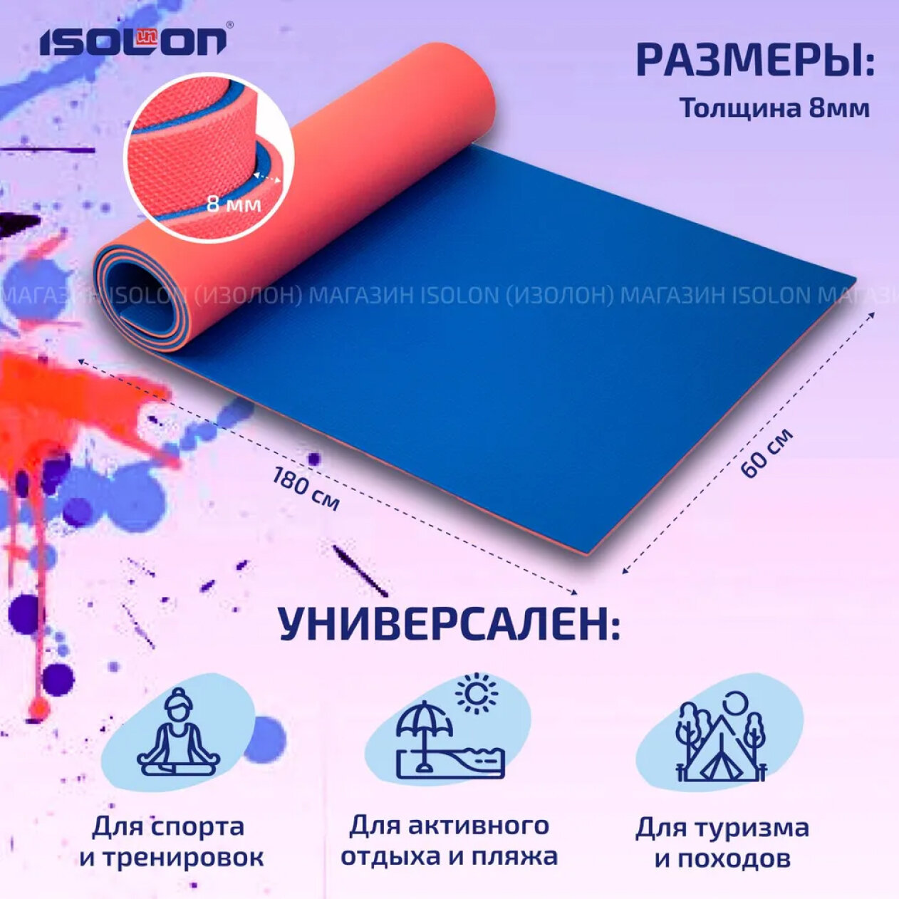 Коврик для фитнеса и йоги Sport8 плотный, 180х60 см, малиновый/васильковый информация:
