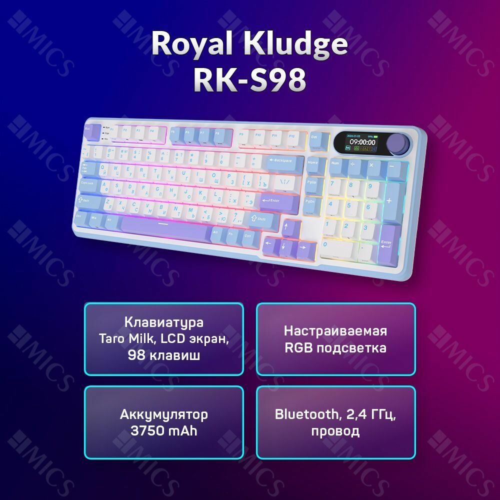 10 цен на Беспроводная механическая клавиатура Royal Kludge RK-S98 (96%) цвет Taro Milk, RGB, Hot Swap, тактильные свитчи (RK Brown)