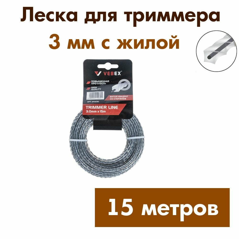 Леска для триммера с жилой VEBEX (витой квадрат) 3 мм длина 15м информация: