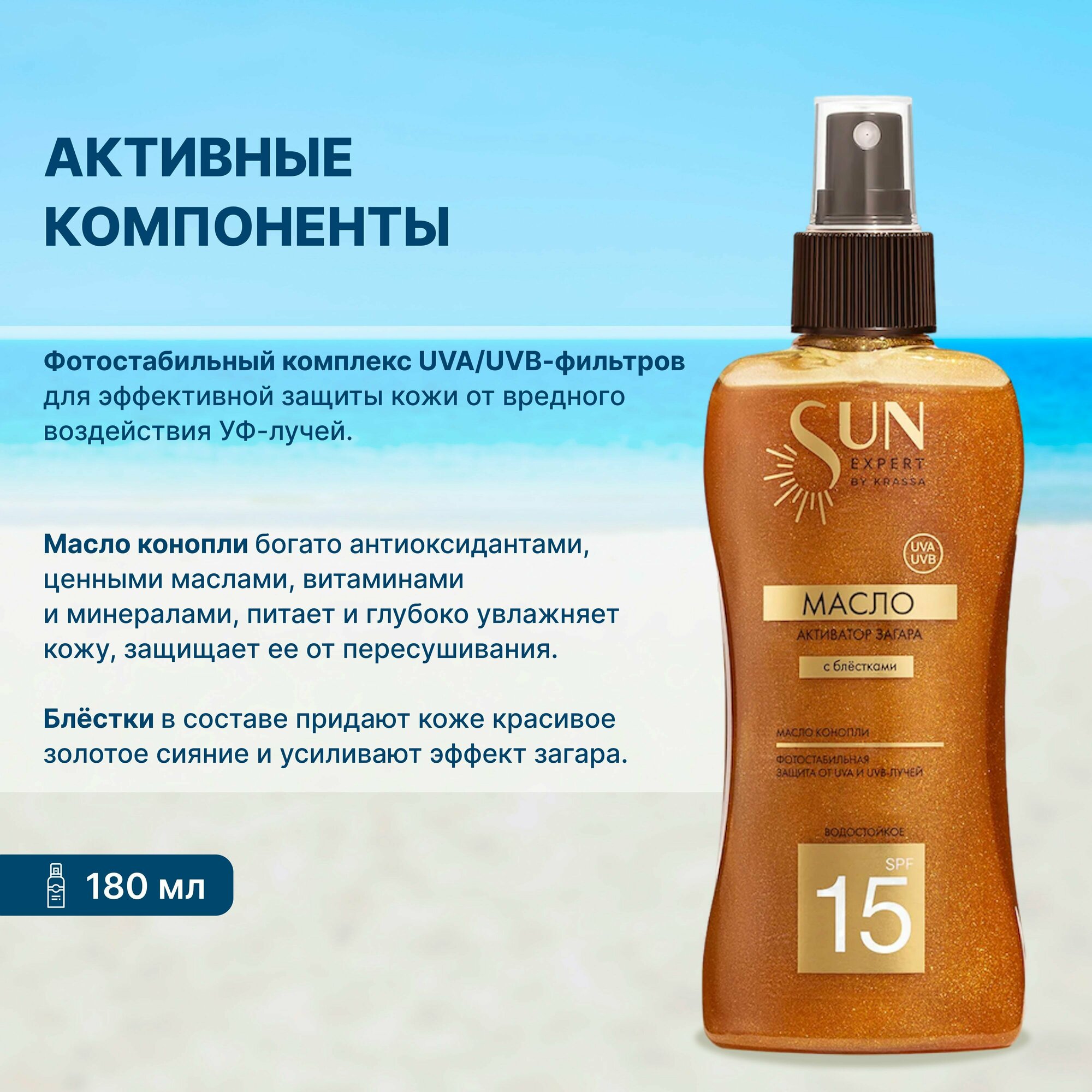 Масло для загара активатор с шиммером SPF 15 SUN EXPERT by KRASSA, 180 мл с маслом конопли для тела