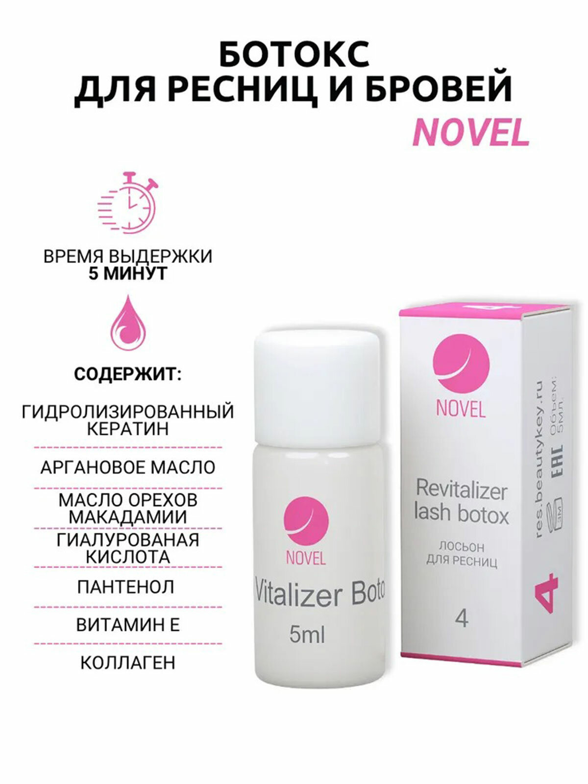 | Дополнительная информация | Ботокс для ресниц укрепление и стимуляции роста после процедуры ламинирования NOVEL Lash Vitalizer, 5 мл |
