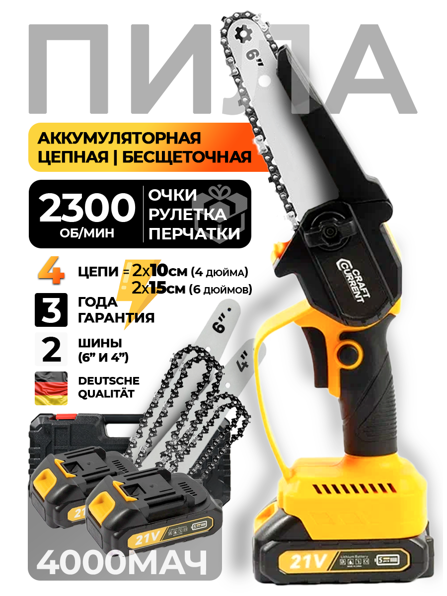 10 цен на Цепная пила CraftCurrent, 2 аккумулятора, 2 цепи в комплекте, антивибрационная, 21В