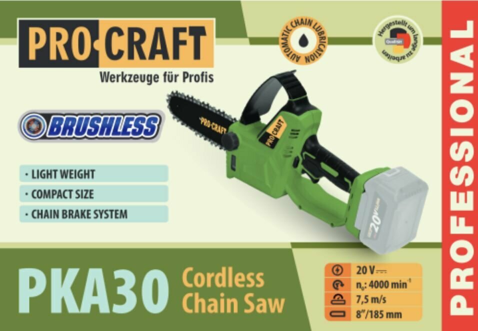 Аккумуляторная цепная пила, бесщеточная Procraft PKA30, (комплект 1АКБ и ЗУ) 20 В, 4 А/ч, 4000 об/мин информация: