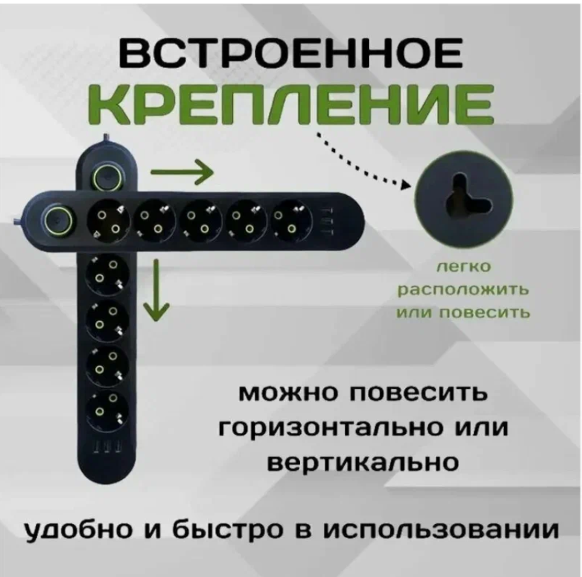 10 цен на Сетевой фильтр с 5 розетками и 3 USB-портами, 3 метров, 10A, черный цвет