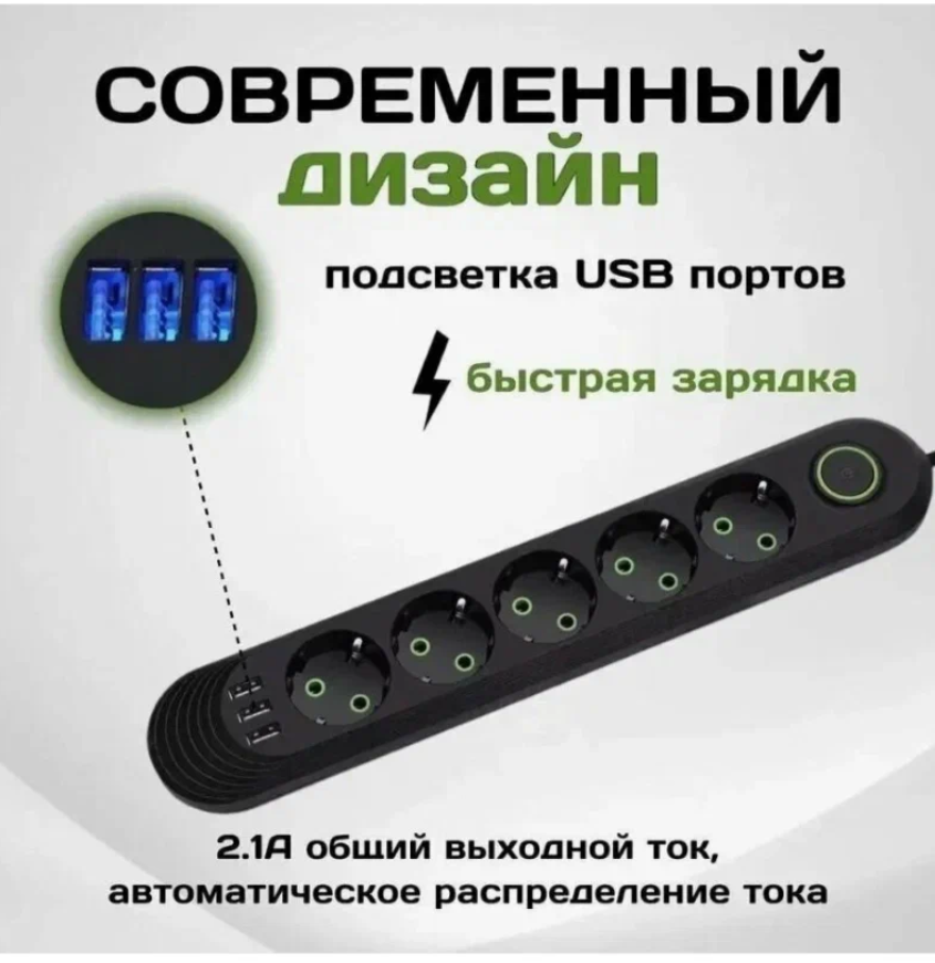 Отзывы на Сетевой фильтр с 5 розетками и 3 USB-портами, 3 метров, 10A, черный цвет