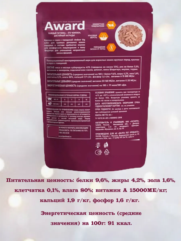 Влажный корм AWARD Indoor big cats для взрослых домашних кошек крупных пород кусочки в соусе с говядиной 85 г 12 шт. информация: