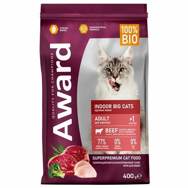 AWARD Indoor Big cats 400г сухой корм для взрослых домашних кошек крупных пород с говядиной и курицей, с добавлением брокколи и юкки Шидигера информация: