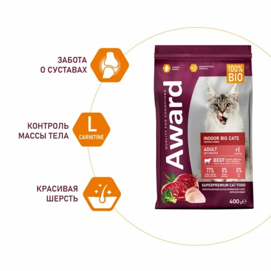 AWARD Indoor Big cats 400г сухой корм для взрослых домашних кошек крупных пород с говядиной и курицей, с добавлением брокколи и юкки Шидигера 444 ₽