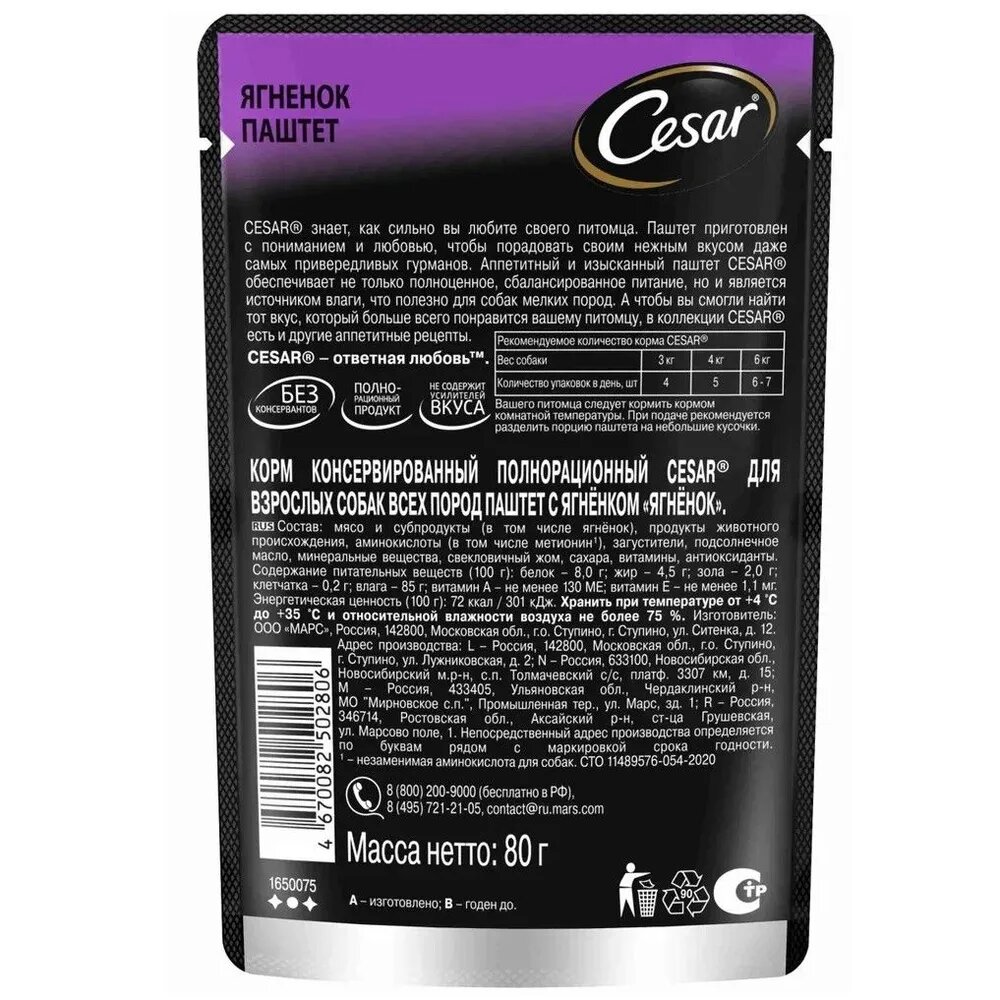Цезарь 10400294 пауч для собак паштет Ягненок 80г информация: