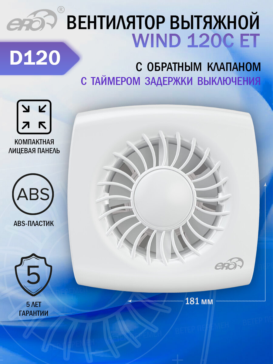 Вентилятор вытяжной осевой ERA WIND 120C ET, с обратным клапаном и таймером, настенный, белый, D 120 мм информация: