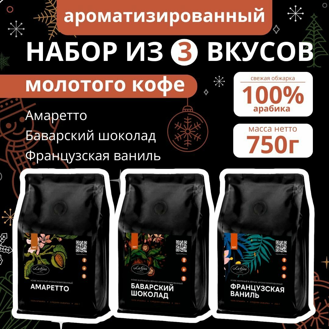 Набор молотого кофе 3 шт по 250 гр Амаретто, Баварский шоколад, Французская ваниль 100% арабика, ароматизированный информация: