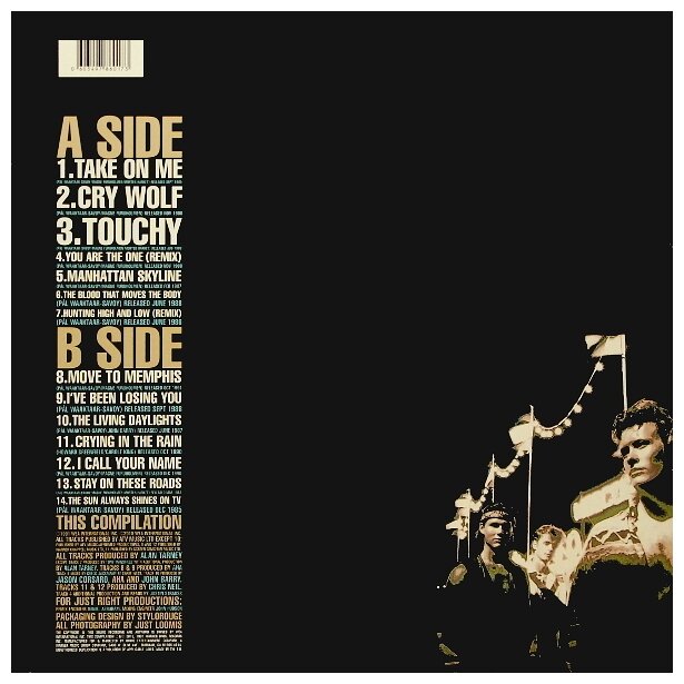 | Треклист | A1. Take On Me A2. Cry Wolf A3. Touchy! A4. You Are The One (Remix) A5. Manhattan Skyline A6. The Blood That Moves The Body A7. Hunting High And Low (Remix) B1. Move To Memphis B2. I've Been Losing You B3. The Living Daylights (Single Version) B4. Crying in the Rain B5. I Call Your Name B6. Stay On These Roads B7. The Sun Always Shines On T.V. |