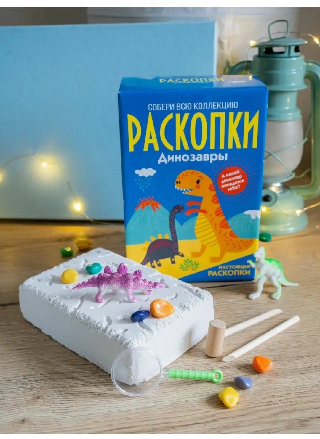 | Комплектация | деревянный молоточек, деревянный стек для дробления, окаменелый грунт, артефакты (россыпь разноцветных находок из пластика), мешочек для находок |