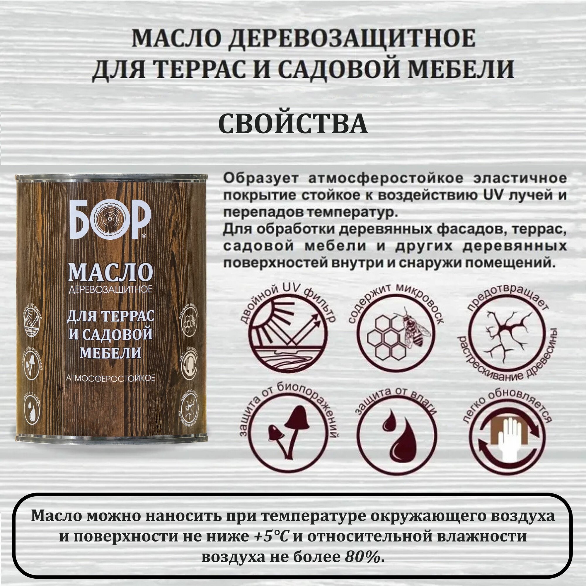 Масло для дерева БОР для террас и мебели с воском Орех 0,64 кг информация: