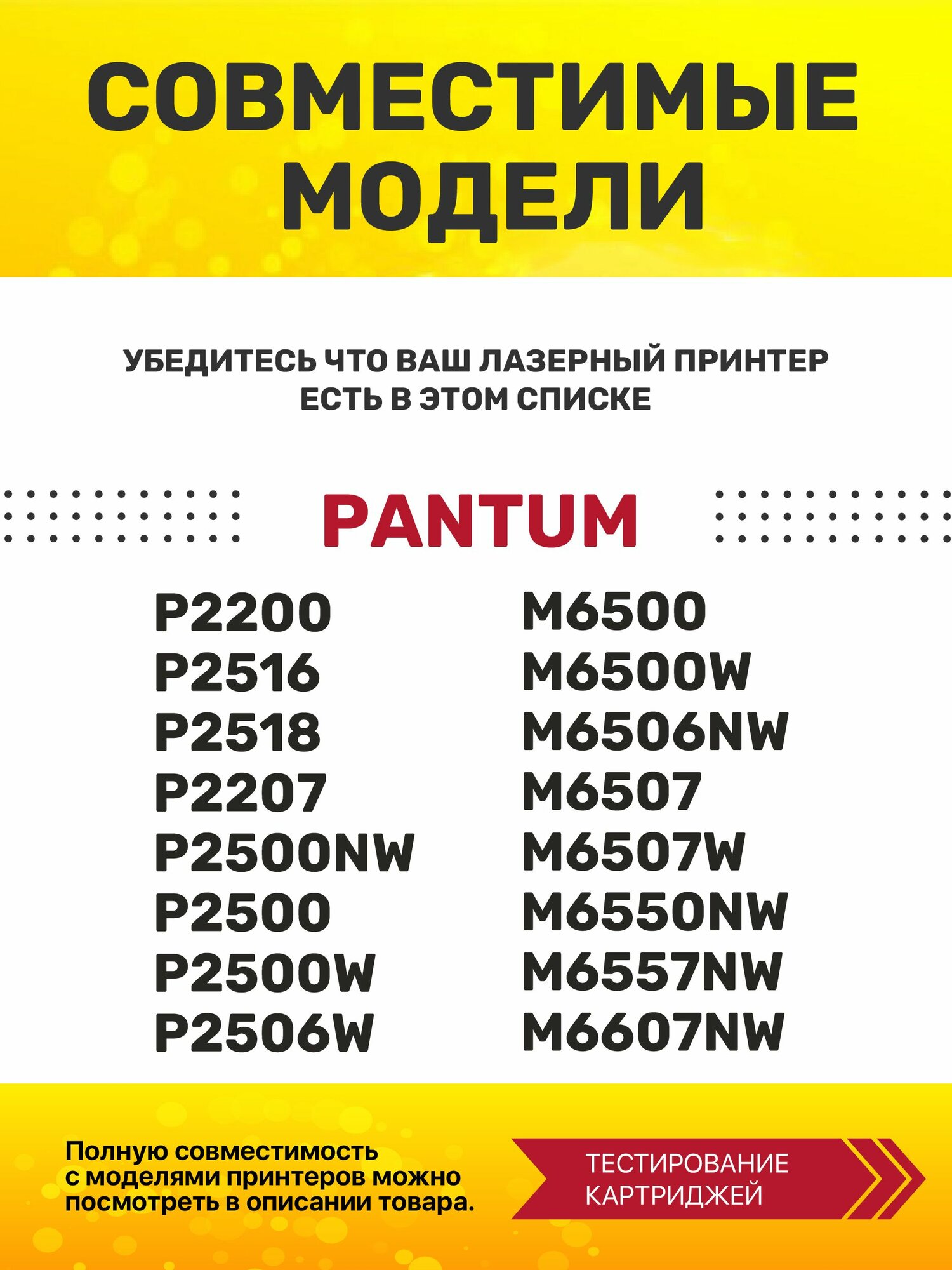 | Модель совместимого принтера | Pantum M6500 / Pantum M6507 / Pantum P2207 / Pantum P2500 / Pantum P2516 / Pantum P2518 |