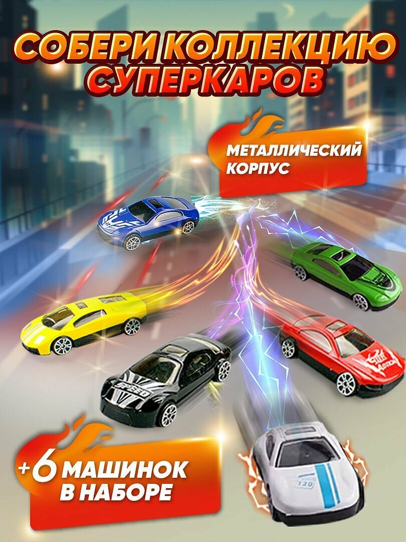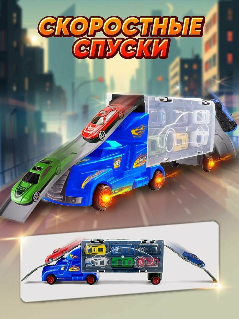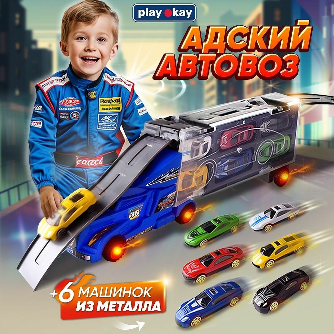 Автовоз с машинками Play Okay грузовик, двусторонний паркинг, движение по инерции, 6 металлических машинок в наборе, удобно хранить и брать с собой информация: