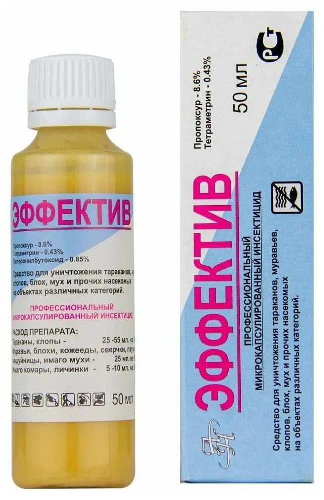 Эффектив (Эфектив) 50 мл. микрокапсулированное средство от насекомых (без запаха) - используется для уничтожения клопов, разных видов тараканов, муравьев, блох, личинок комаров, кожеедов, чешуйниц, а также сверчков и пауков.