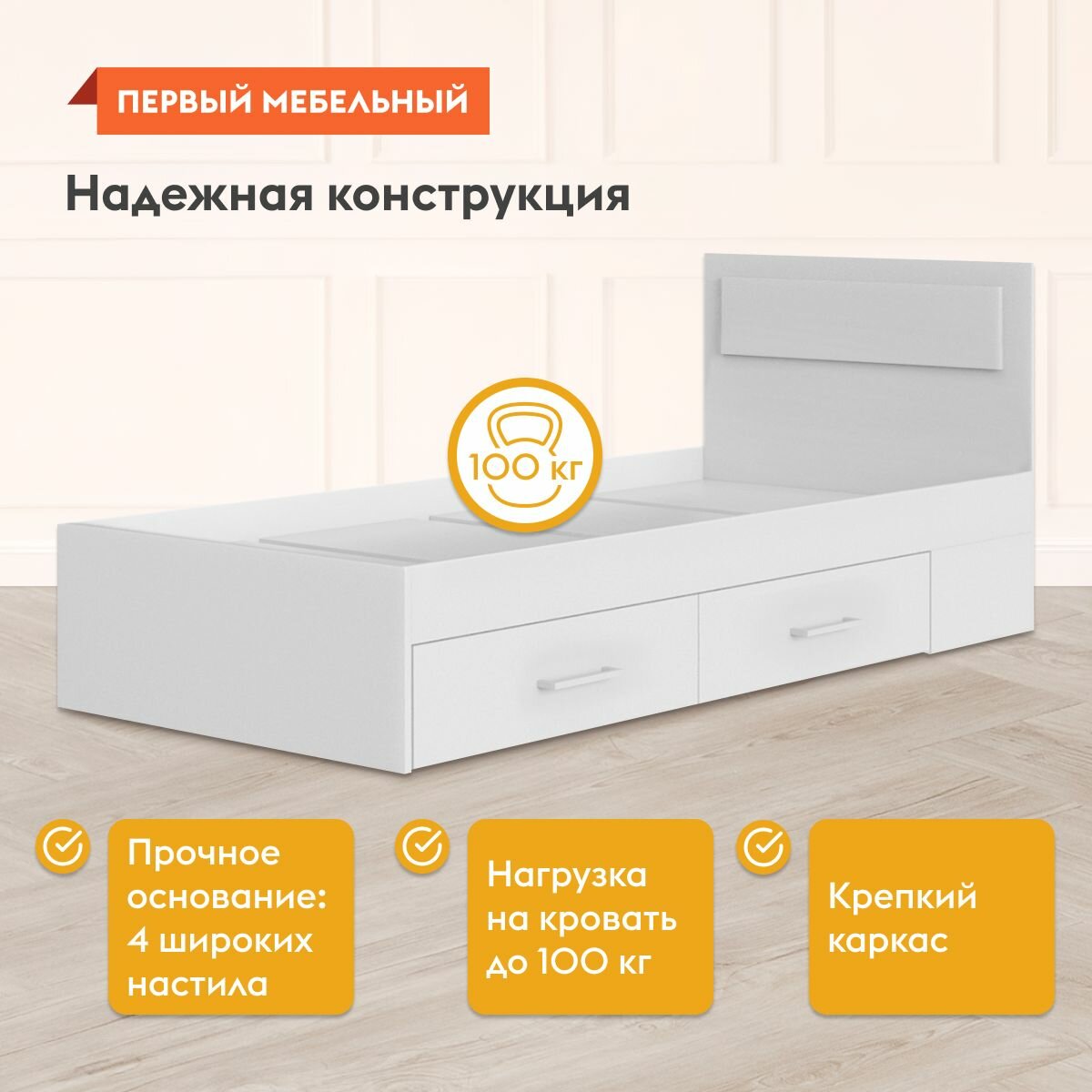 Односпальная кровать Жаклин 90х200 см, основание настил, с ящиками, Белый информация:
