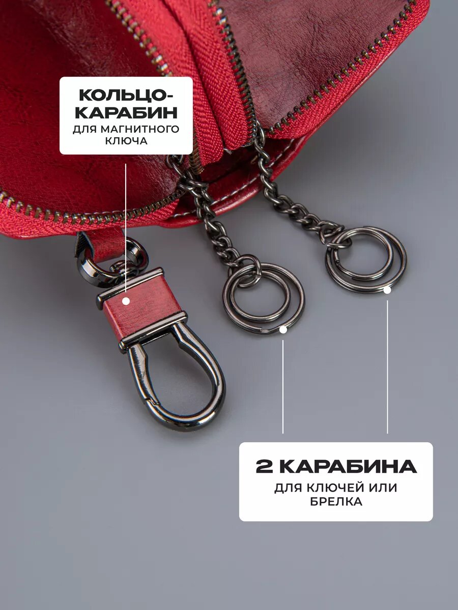 Ключница из натуральной кожи, 2 отделения на молнии, карабин, красный информация:
