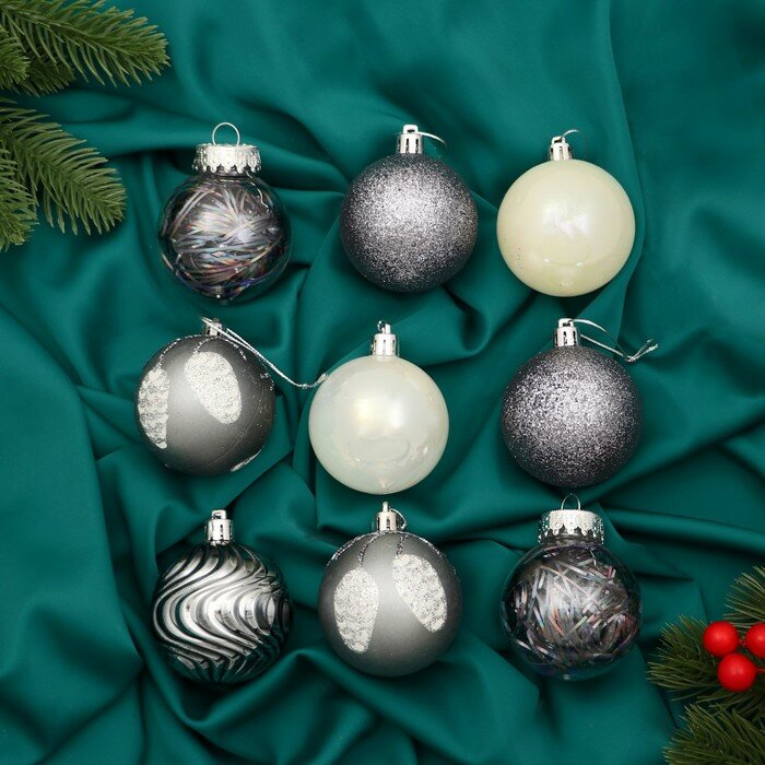 Набор шаров пластик d-5 см, 12 шт "Новогодние ветви" серый 4316795