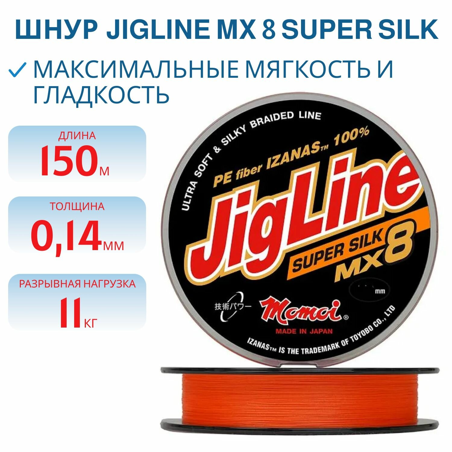 Плетеный шнур для рыбалки Momoi JigLine MX8 Super Silk 150м, 0,14мм, 11кг, оранжевый