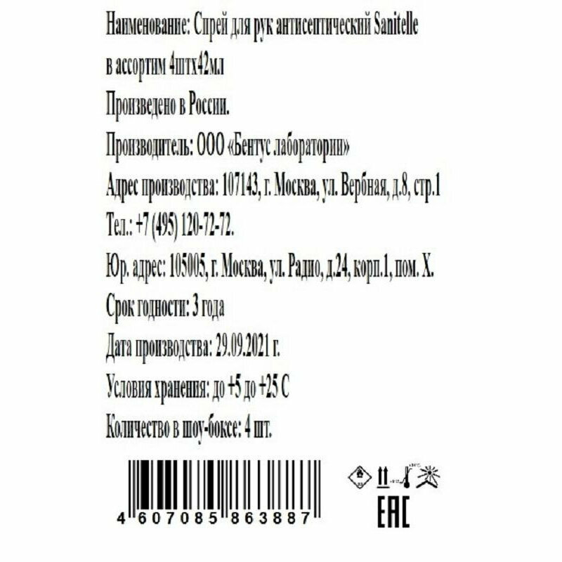 Спрей для рук антисептический Sanitelle 42 мл (4 штуки в упаковке), 1546600 информация: