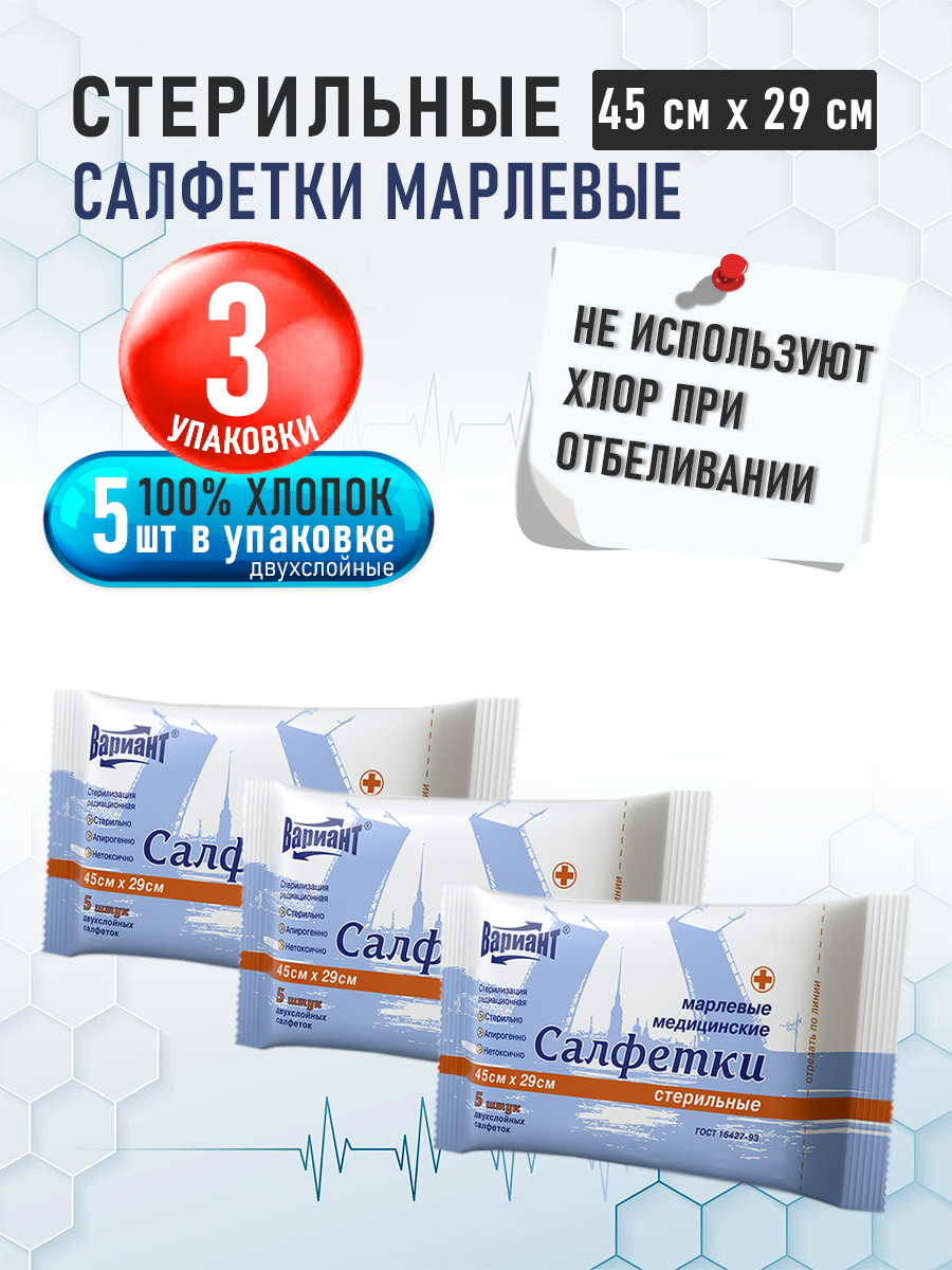 Салфетки марлевые Вариант медицинские стерильные двухслойные 45 см х 29 см, №5, 3 упаковки в наборе информация: