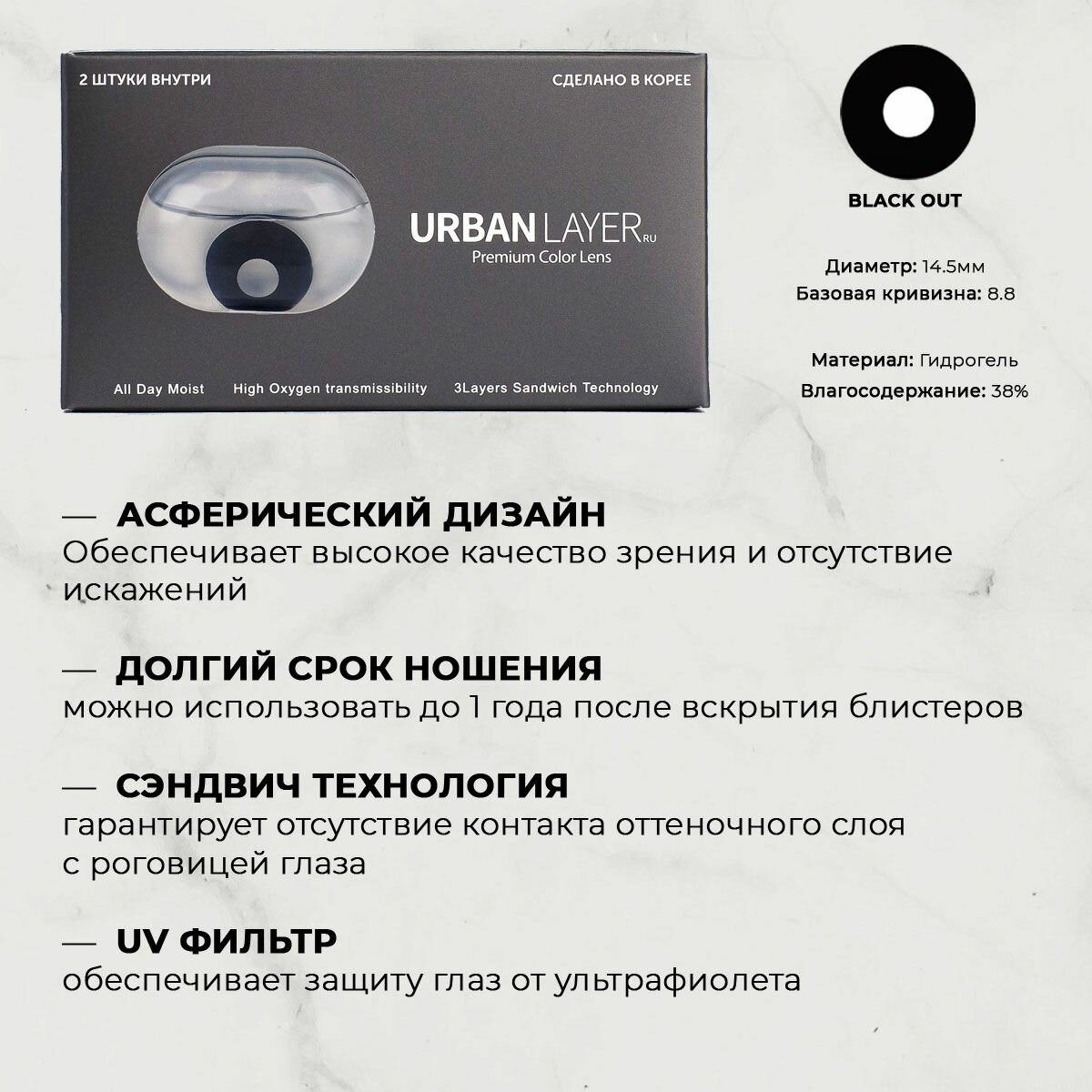 Цветные контактные линзы URBAN LAYER ru Black Out -2.5 / 14.5 / 8.8 / 2шт. информация: