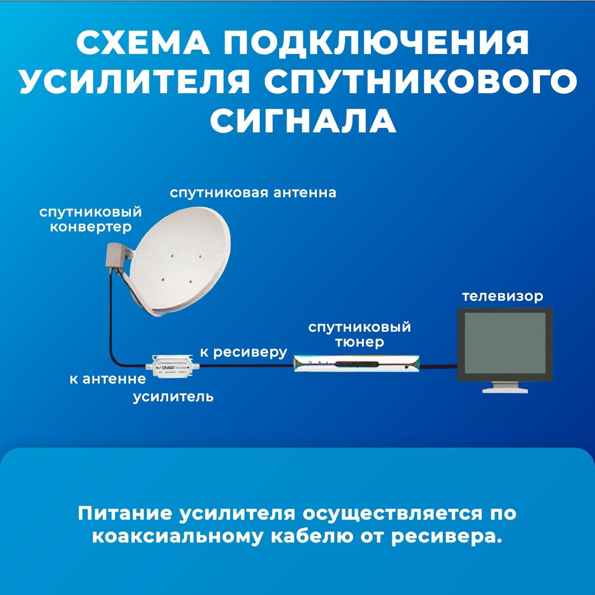 | Дополнительная информация | диапазон частот :950-2150 Mhz; коэффициент усиления : 20db; питание усилителя осуществляется по коаксиальному кабелю от ресивера |