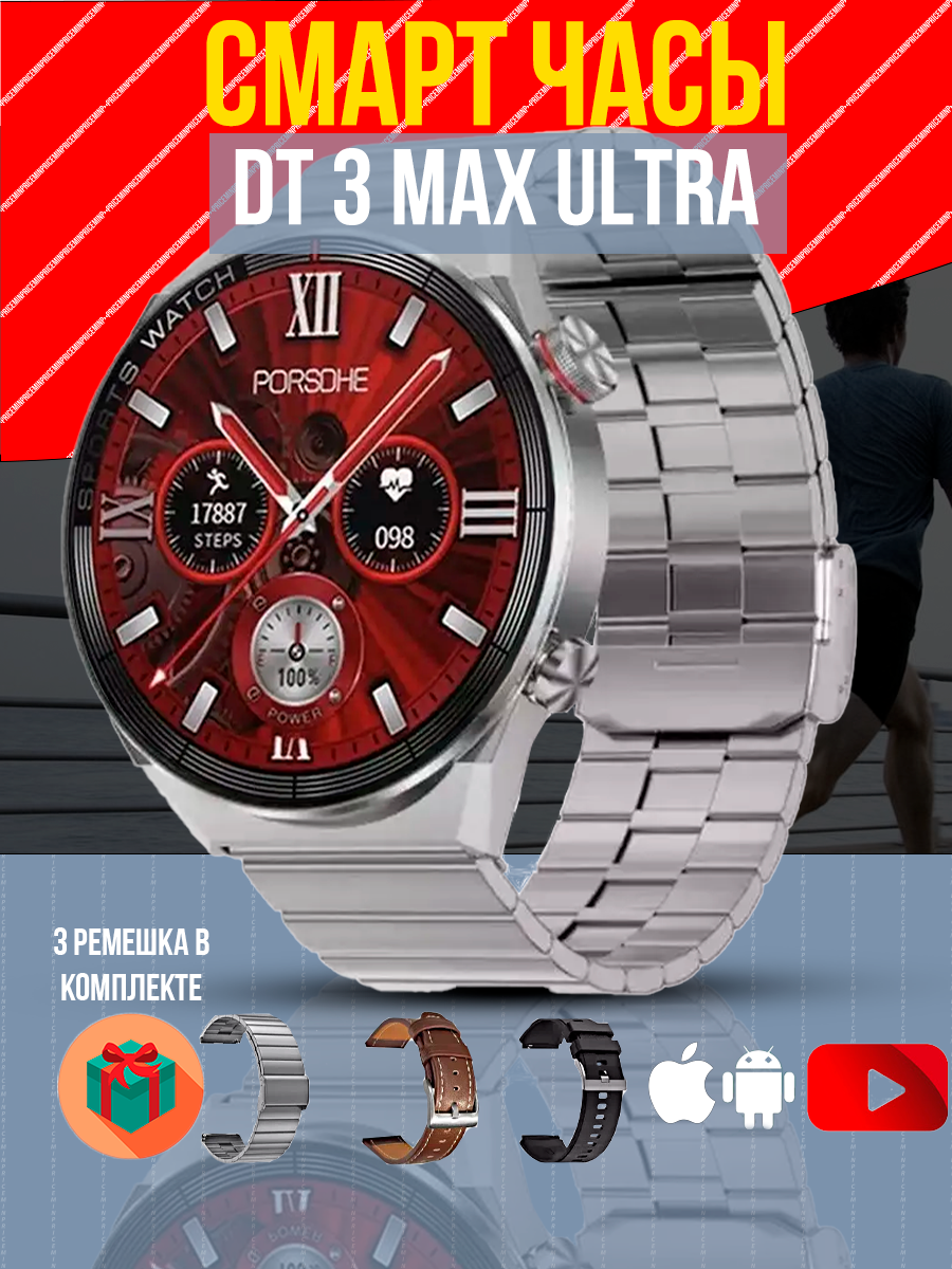 Отзывы на Cмарт часы DT3 MAX ULTRA PREMIUM Series Smart Watch 3 ремешка, iOS, Android, Bluetooth звонки, Уведомления, Серебристые