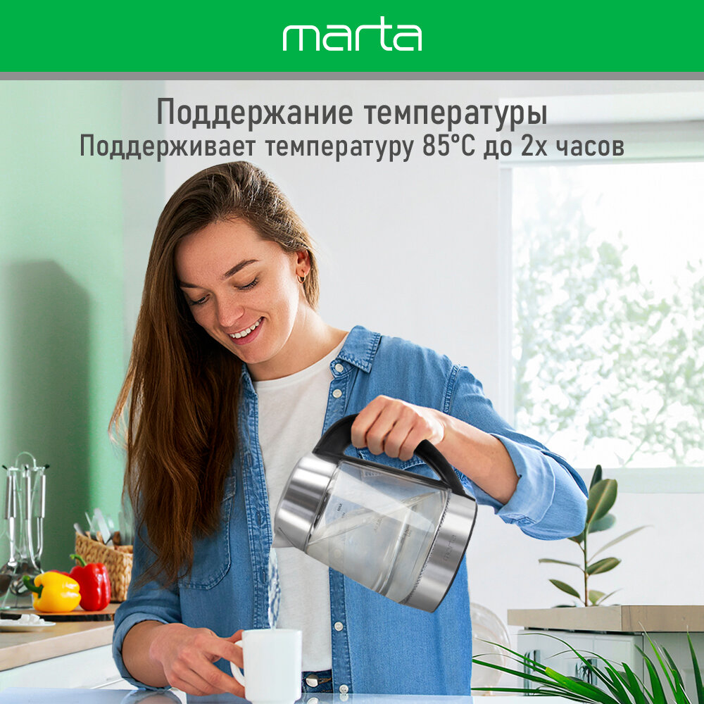 Электрический чайник MARTA MT-KT4655A черный стеклянный с заварником, 1.8 л