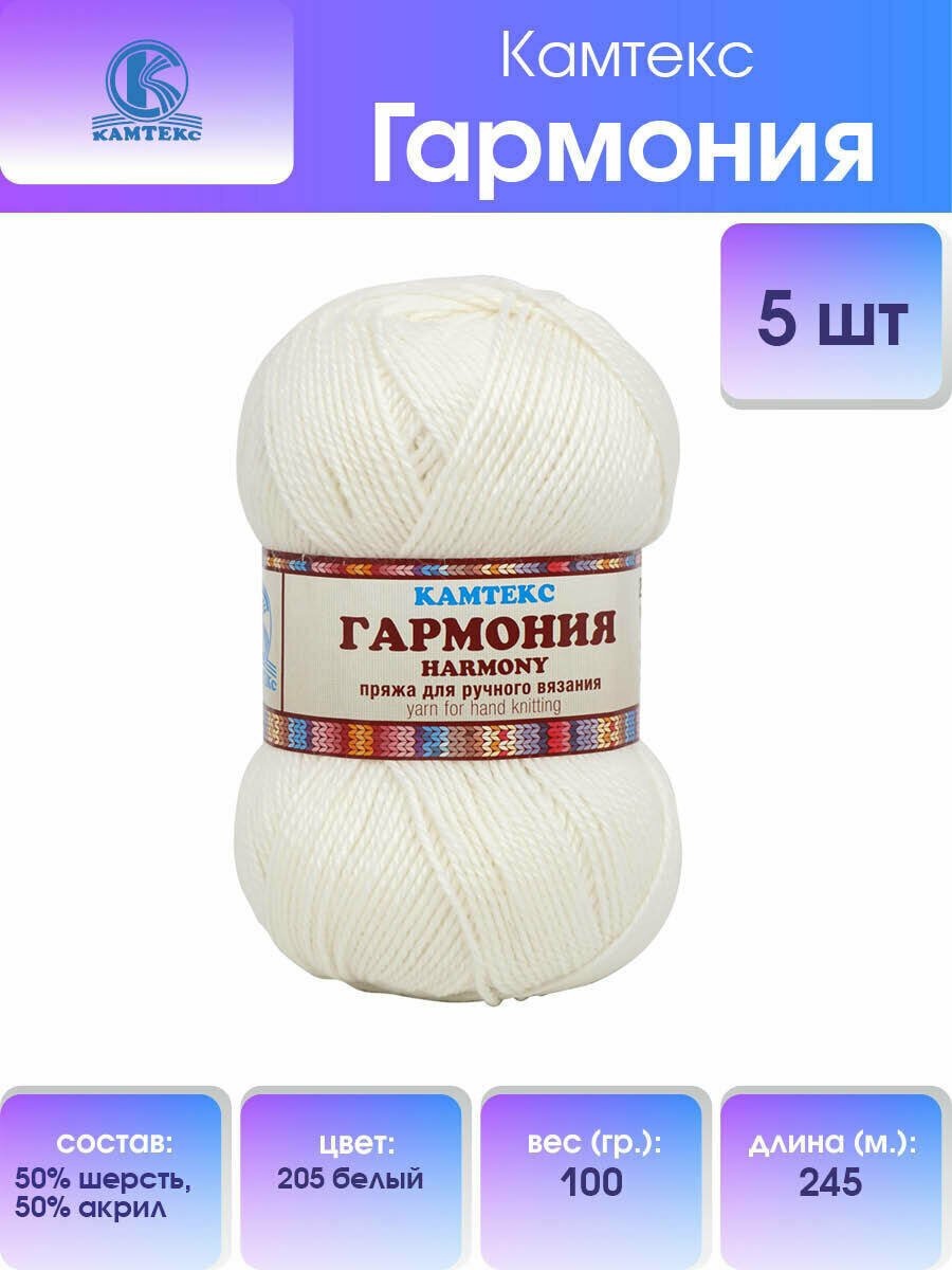Пряжа для вязания Камтекс 'Гармония' 100г, 245м (50% шерсть, 50% акрил) (205 белый), 5 мотков информация: