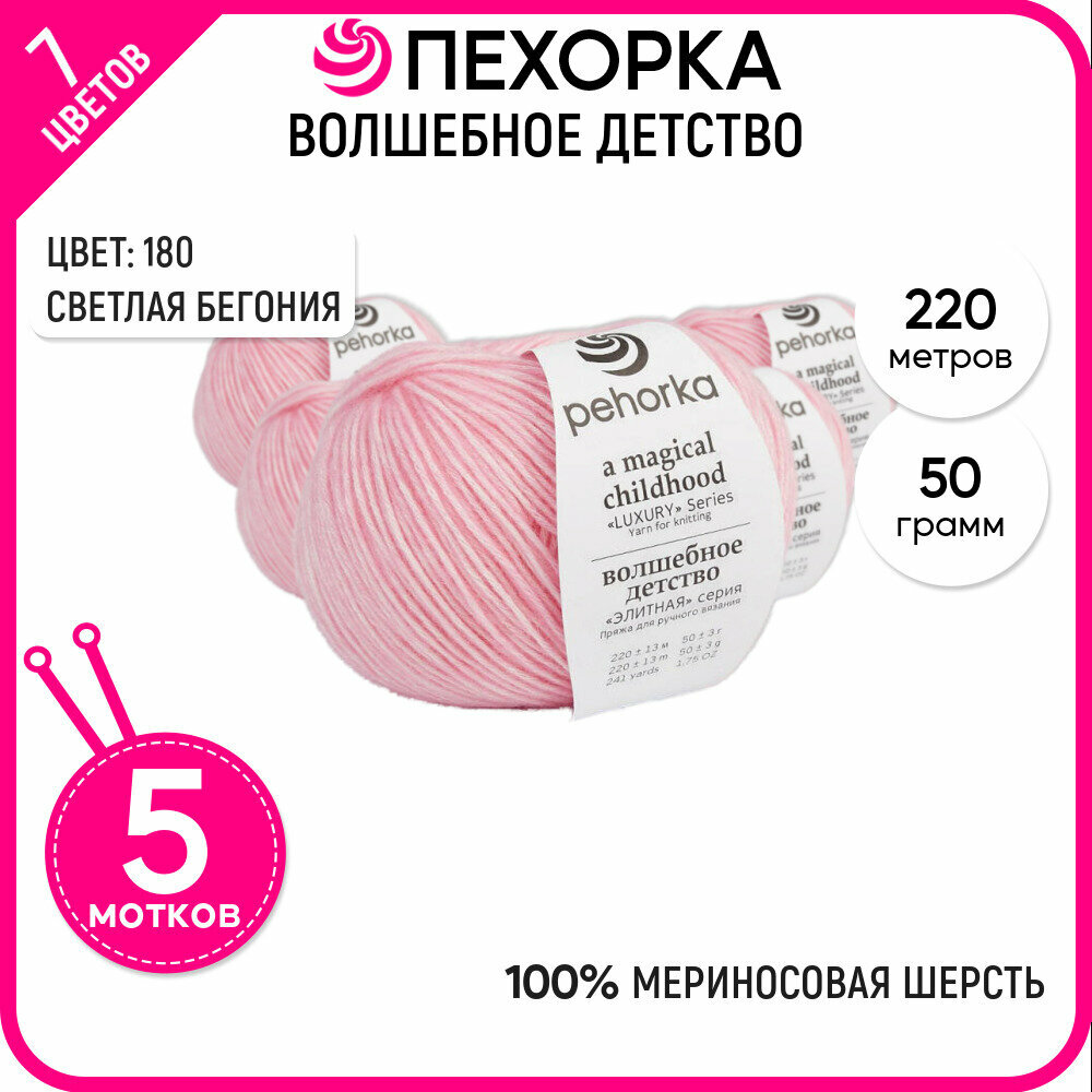 Пряжа Волшебное детство Пехорка, св.бегония - 180, 100% мериносовая шерсть, 5 мотков, 50 г., 220 м. информация: