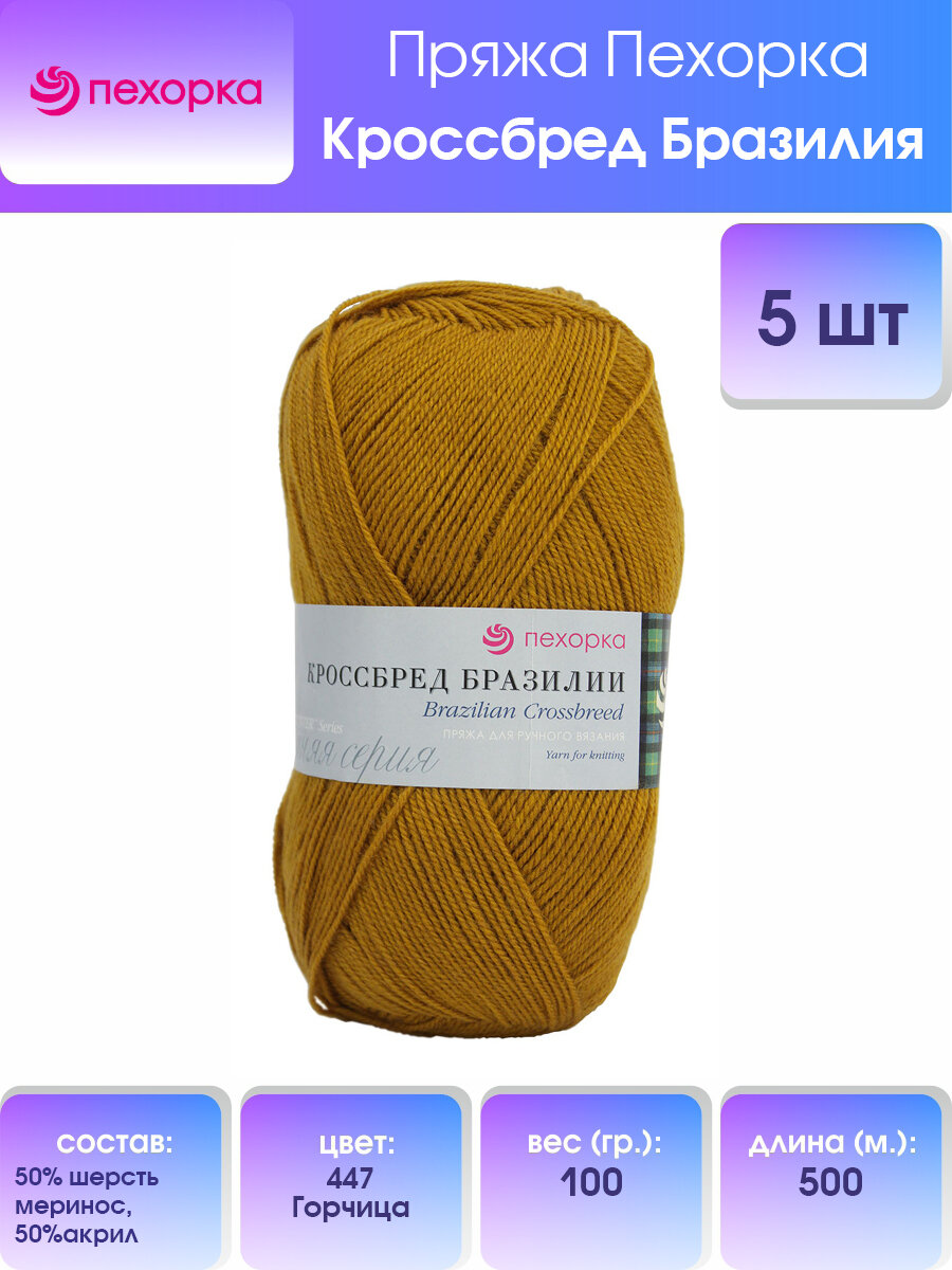 10 цен на Пряжа Кроссбред Бразилии (Пехорка), Горчица - 447, 50% мериносовая шерсть, 50% акрил, 5 мотков, 100 г., 500 м.