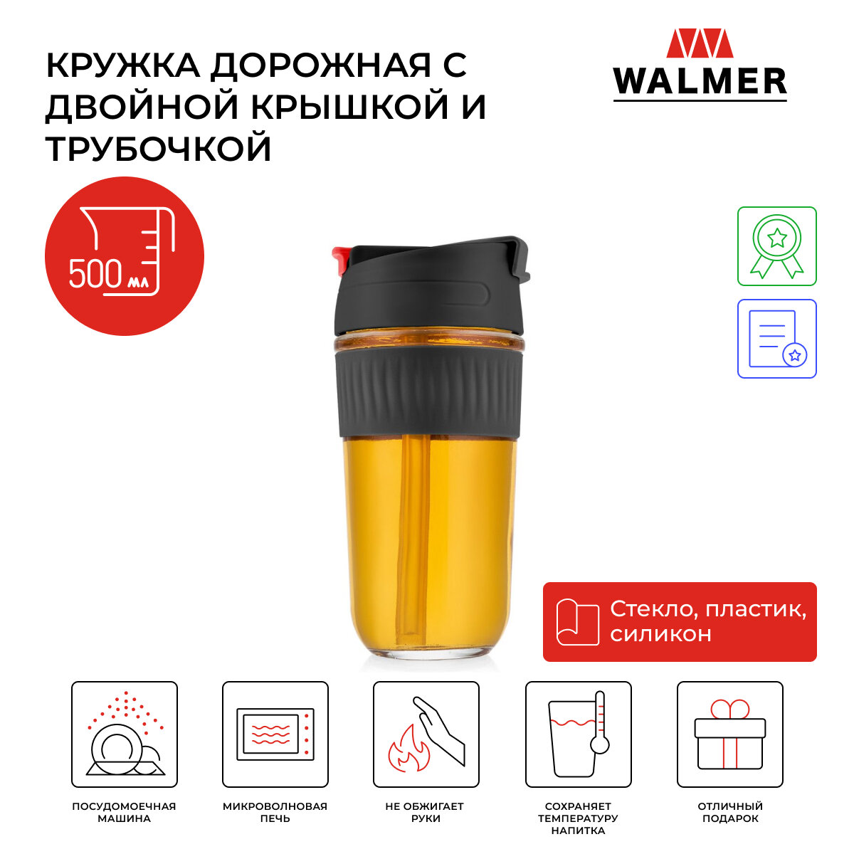 Отзывы на Кружка Walmer дорожная стеклянная Duality 500 мл с двойной крышкой для питья с трубочкой (чёрный) (W24230002)
