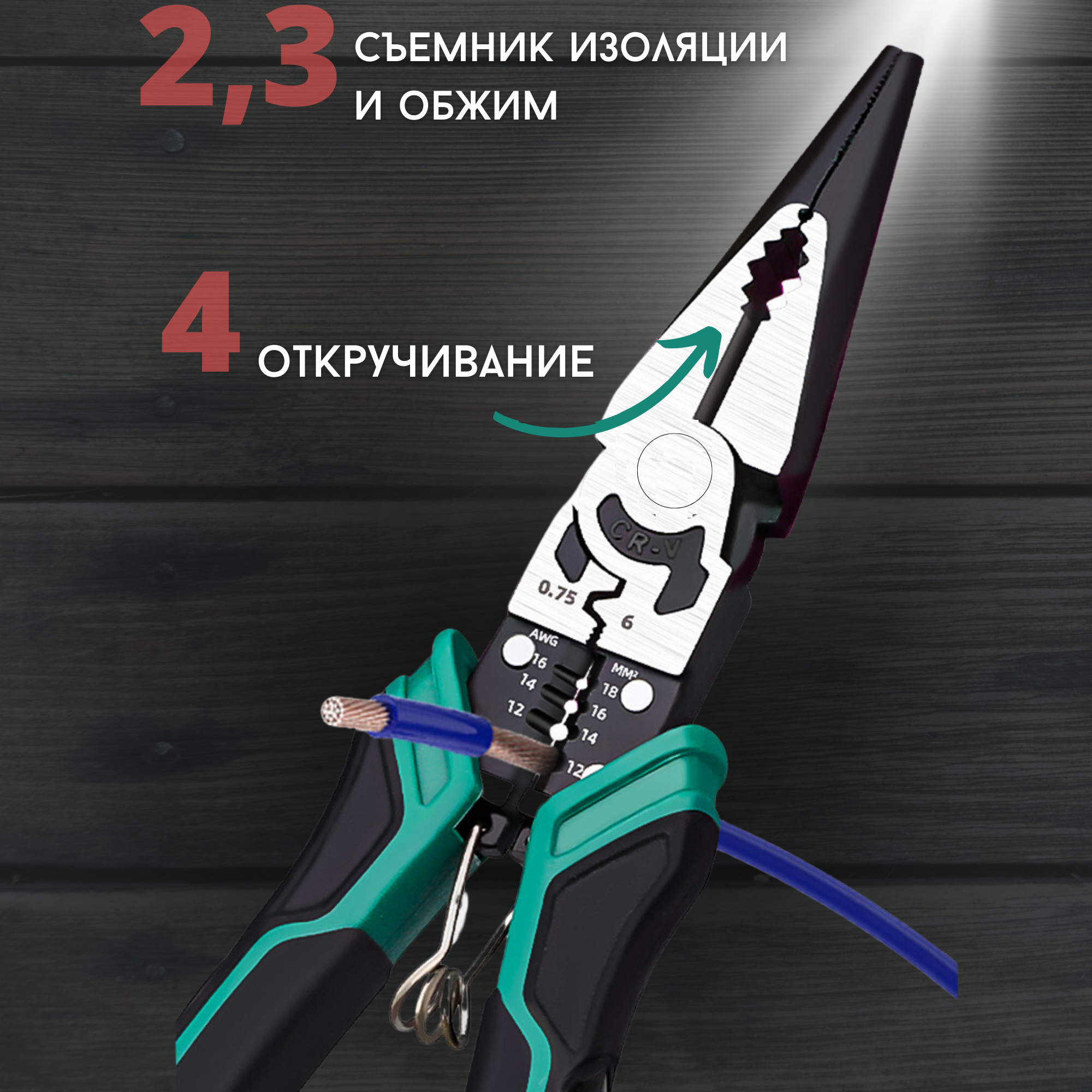 Длинногубцы многофункциональные 12 в 1, 220 мм, CR-V – хромванадиевая сталь, грандмастер, LNP-220, 671254