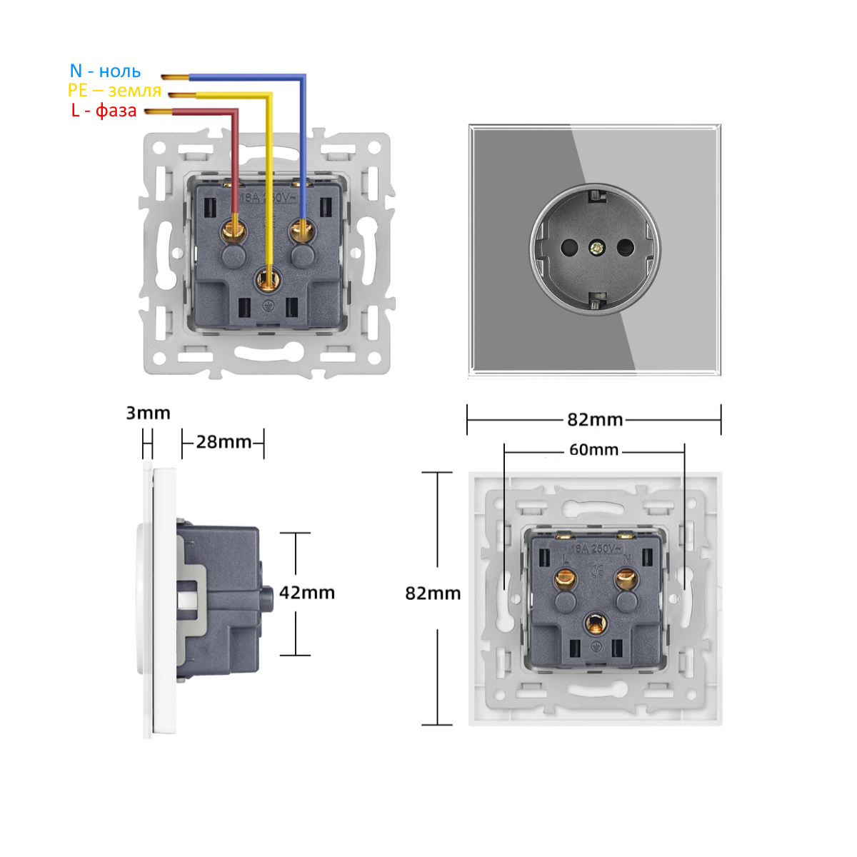 Розетка одинарная 220в 16А рамка из закаленного стекла, Серый. F8 информация: