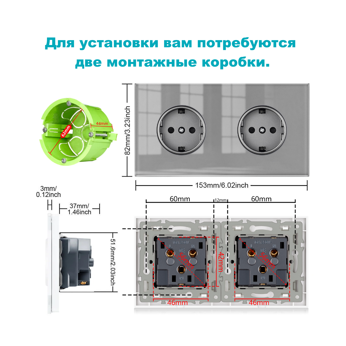 Отзывы на Розетка двойная 2 поста 16А 250В, со шторками, рамка закаленное стекло, Серый. F8