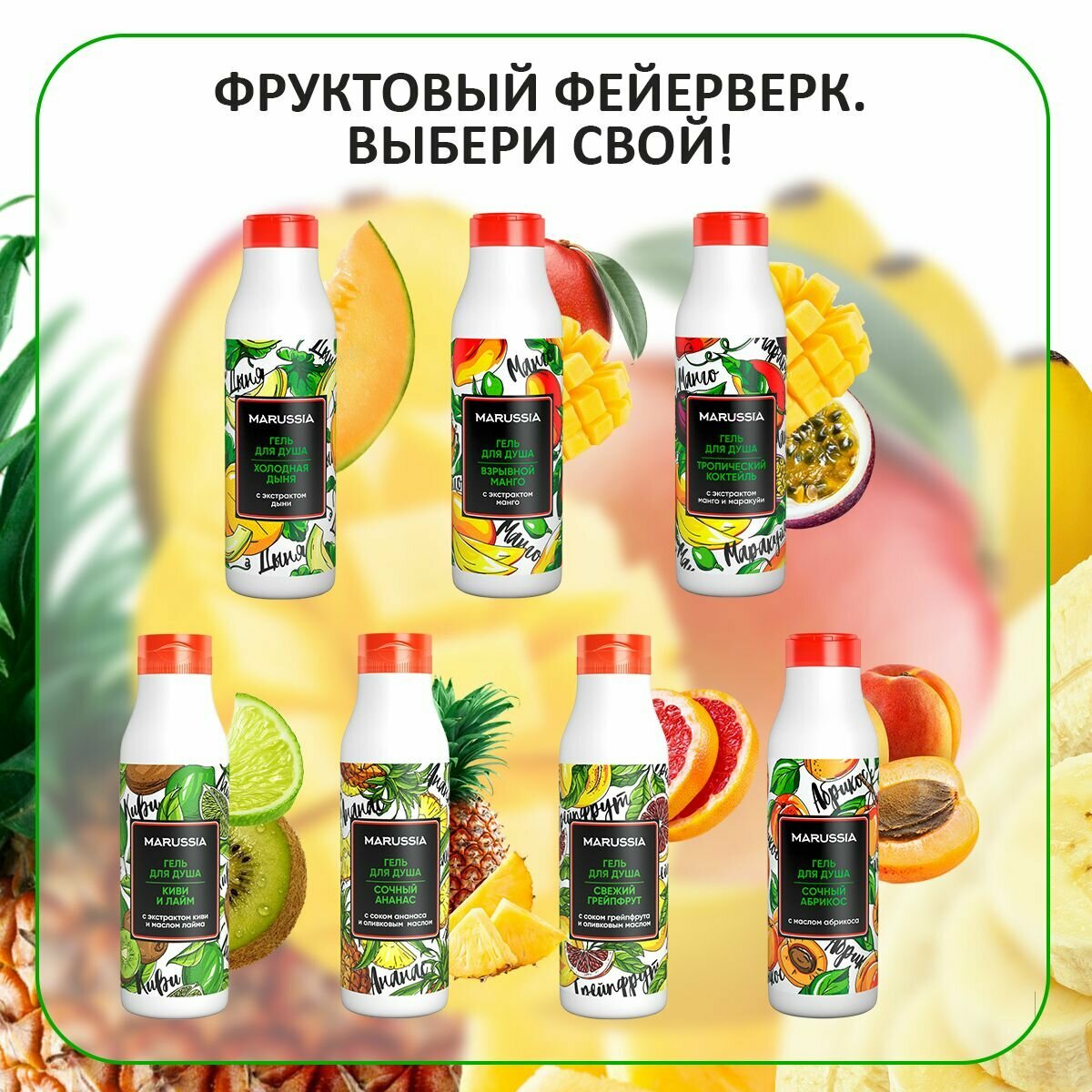 | Аромат | абрикос / ананас / вишня / гранат / грейпфрут / грейпфрут и бергамот / дыня / лайм / манго / папайя / лемонграсс / питахайя / нероли / тропический коктейль |
