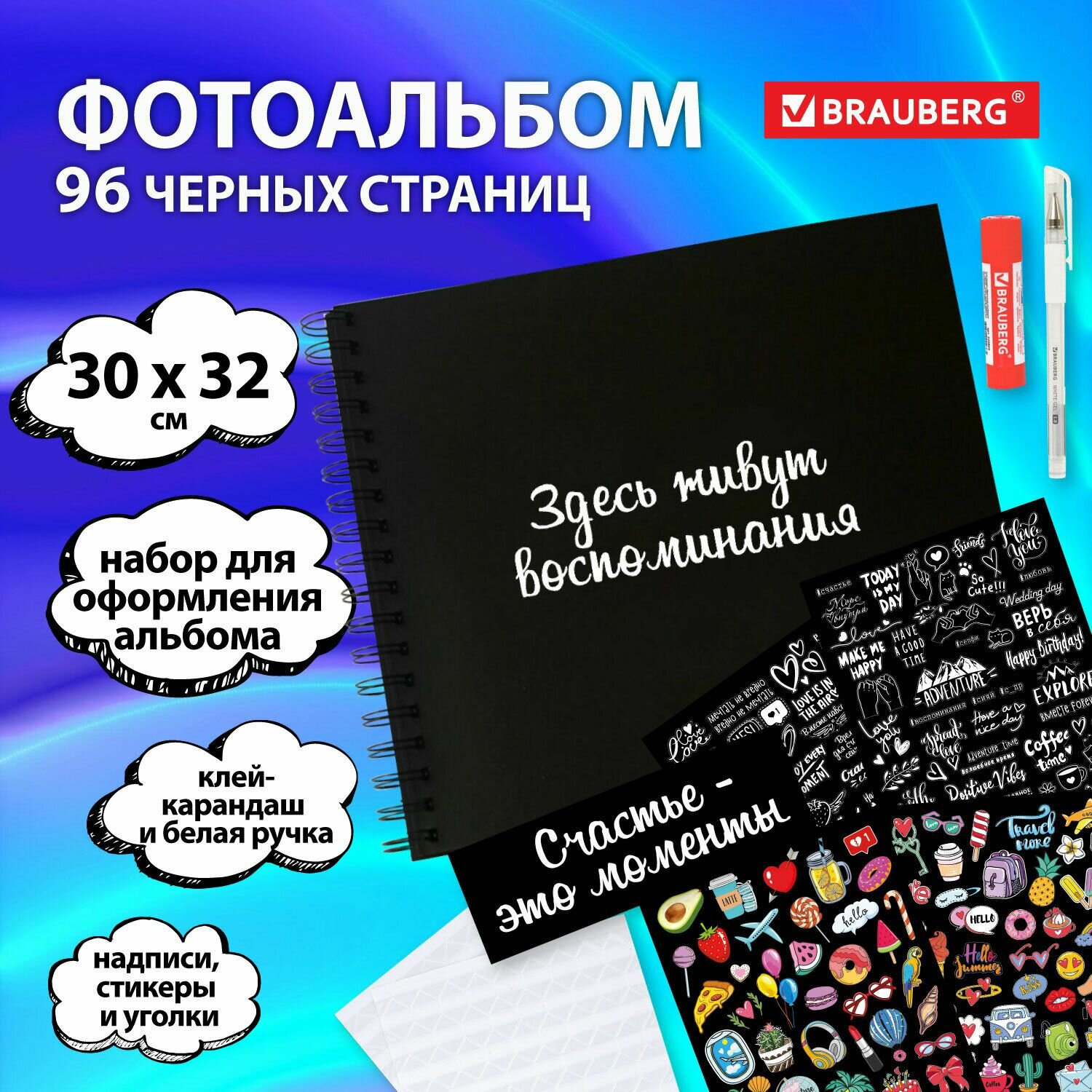 10 цен на Фотоальбом 30х32 см, 48 черных листов, уголки, стикеры, ручка, клей, BRAUBERG Black Line, 880650